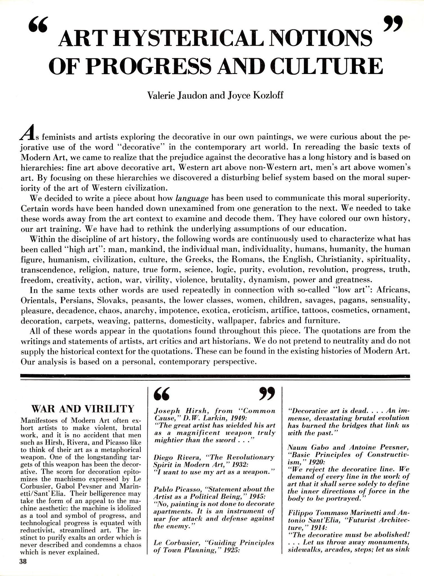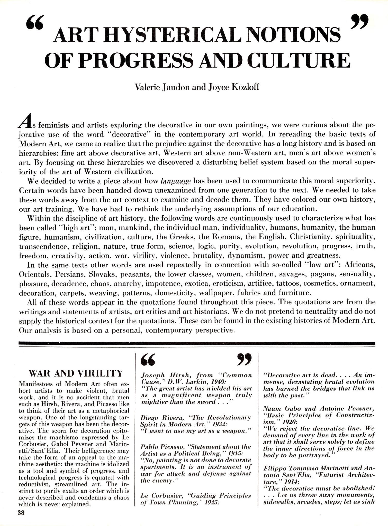 Modernists saw themselves as representatives of “the culture”, which was, in their minds, Western, straight, male and attached to its own siloed history and sense of importance. Jaudon and Kozloff showed how language was used to shape that perception and manipulate outcomes. They hoped their essay would inspire readers to challenge the assumptions of their education.