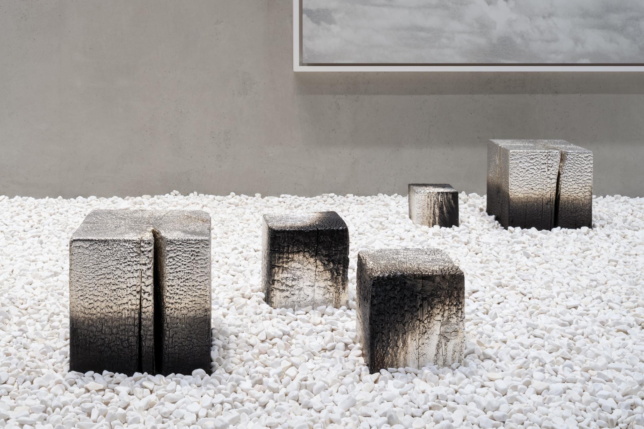On the large wall behind her recreation of Ryōan-ji, Ando placed one of her cloud paintings. For this body of work, Ando photographs clouds, recording the exact date, place and time of the observation, creating a record of a fleeting moment. She later paints amalgams of those clouds in ink on metal. “Clouds are impermanent and the metal suggests permanence, Ando says. That is the language for this inquiry. The work is archival, it is not ephemeral. But the overarching idea is that everything is impermanent.”